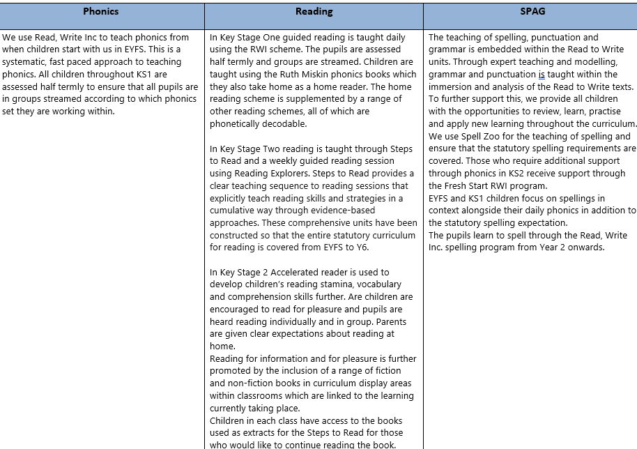 Every week all pupils in Key Stage 2 take part in a guided reading session. Pupils work in small groups studying texts specifically matched to their age and reading ability. Working with small groups enables the teacher to discuss texts in depth at a level which is appropriate to pupils.