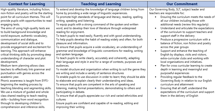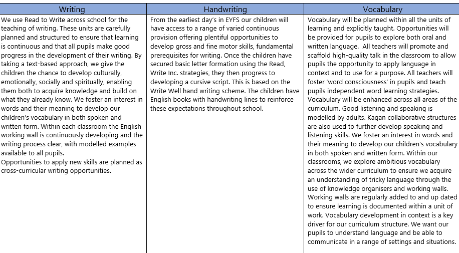 Through the teaching of English, children develop the essential literacy skills needed to prepare them for life. The skills taught in English ensure that children can successfully access all other areas of the curriculum with growing independence and confidence and equip them for their future. At St Mary and St Joseph’s we aim to include and engage all children in high quality learning experiences in order to foster passions for life long reading; while providing the confidence to communicate effectively in both speech and writing. As a school our intent is that our pupils have a chance to develop culturally, emotionally, intellectually, socially and spiritually. Literature, especially, plays a key role in such development. We will strive to ensure every child develops the confidence and competence to embrace literature in its many forms. It is our intent that pupils leave our school as fluent, enthusiastic readers who can fully engage with a wide range of texts, and use their knowledge to competently evaluate an author’s use of language and the impact this may have on the reader. Alongside this we strive for our pupils to enjoy the writing process and be proud of their written skills, possessing a deep appreciation of the written word.